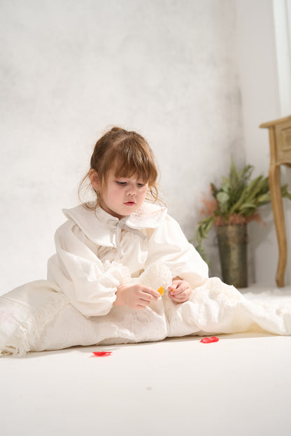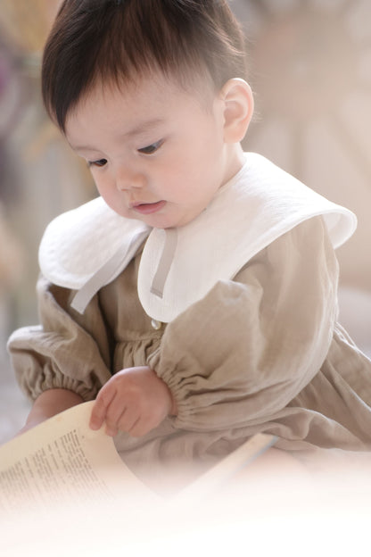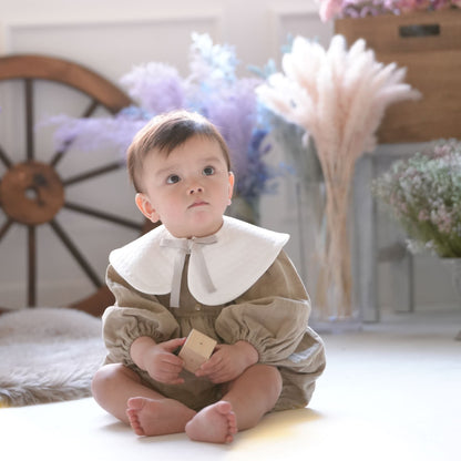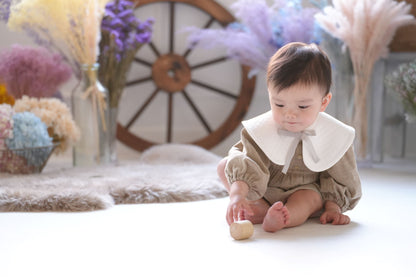 ●付け襟としてコーディネートすると、首元が華やかになり上品な雰囲気を演出します。リボンは縫い付けてあるので結ぶ必要がなく簡単に使用できるのでパパやママに優しいデザイン。