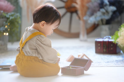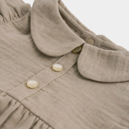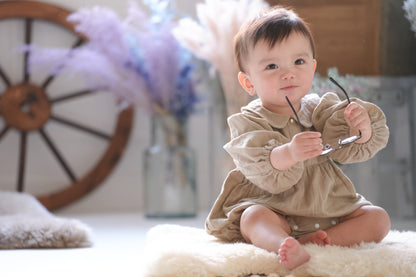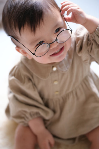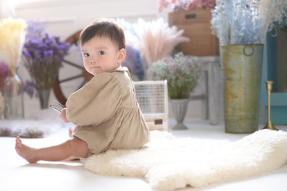 ●ボリューミーな裾とデザインスリーブ、丸い襟が他にはないキュートな1枚です。胸から下はたっぷりギャザーが入っているので、動きが活発なベビーも動きやすく快適に着られます。足口にゴムをいれて、ふっくら可愛らしいシルエットにデザインしました。前身頃は飾り釦、着せやすい後ろあきのデザインです。