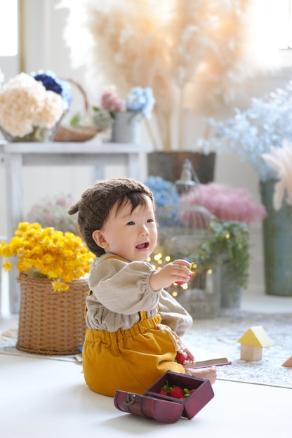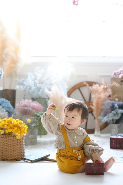 ●肩紐付きのかぼちゃパンツとコーディネートのオススメです。1枚で着てもかわいい、ベビーの可愛らしさを引き立てます。